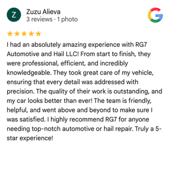 Together, Angelica and Edgar, lead a team that’s redefining the auto hail repair experience. Today, RG7 is proud to offer specialized services in Hail Damage Repair, Paintless Dent Repair (PDR), ceramic coating, and auto detailing—all delivered by a crew that treats every vehicle like their own.
